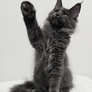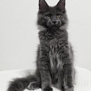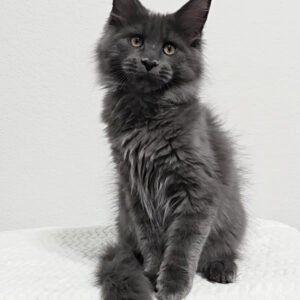 Hello, I’m Bear, a Maine Coon boy with a mesmerizing blue smoke coat and warm gold eyes. My fur has a beautiful depth to it — soft blue on the surface with a light smoky undercoat that appears when I move. My body is growing strong and well-proportioned, showing the early signs of the gentle giant I am becoming. I eat Purina One Kitten to support my healthy development and keep my coat thick and glossy.