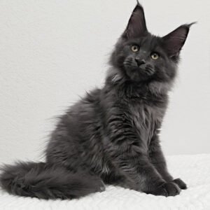 Hello, I’m Bear, a Maine Coon boy with a mesmerizing blue smoke coat and warm gold eyes. My fur has a beautiful depth to it — soft blue on the surface with a light smoky undercoat that appears when I move. My body is growing strong and well-proportioned, showing the early signs of the gentle giant I am becoming. I eat Purina One Kitten to support my healthy development and keep my coat thick and glossy.