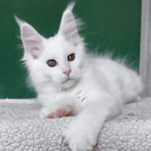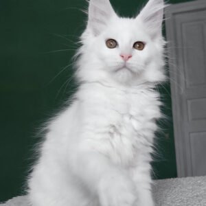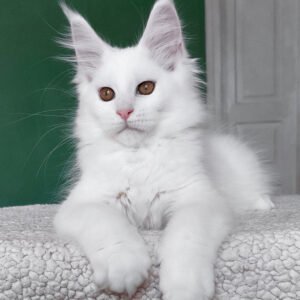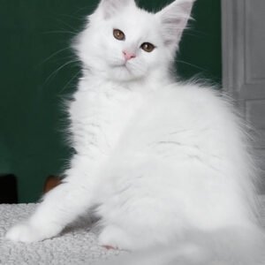 Hello, I’m Daenerys, a Maine Coon girl with a luxurious pure white coat and warm yellow eyes. My body is long and tall, with a strong, well-filled frame that already shows the powerful structure my breed is known for. My ears sit high on my head and are decorated with fluffy tufts, adding to my majestic appearance. My face is expressive and beautiful, and my snow-white coat gives me a bright, elegant presence. I eat Royal Canin Maine Coon Kitten to support my healthy growth and maintain my thick, silky fur.