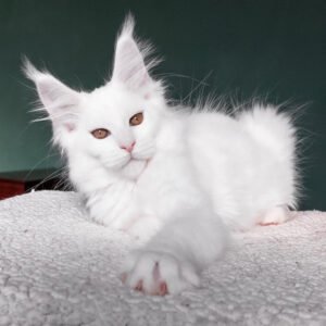 Hello, I’m Daenerys, a Maine Coon girl with a luxurious pure white coat and warm yellow eyes. My body is long and tall, with a strong, well-filled frame that already shows the powerful structure my breed is known for. My ears sit high on my head and are decorated with fluffy tufts, adding to my majestic appearance. My face is expressive and beautiful, and my snow-white coat gives me a bright, elegant presence. I eat Royal Canin Maine Coon Kitten to support my healthy growth and maintain my thick, silky fur.