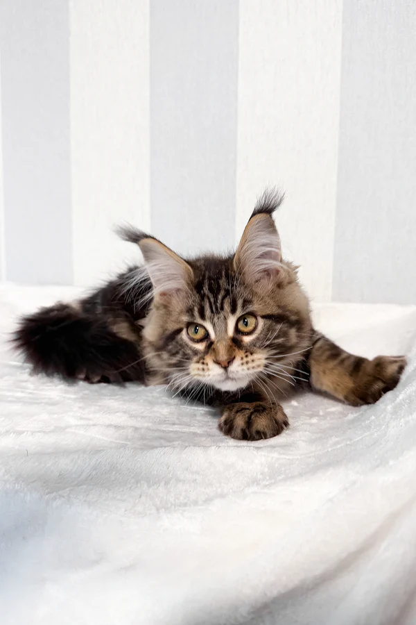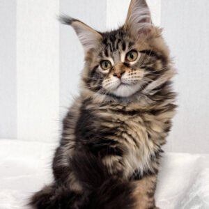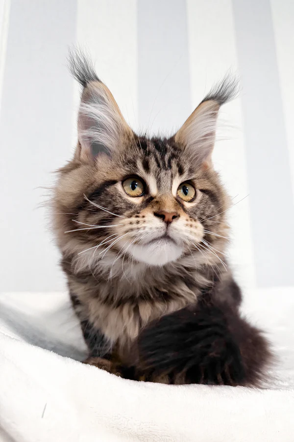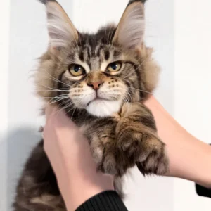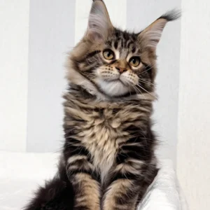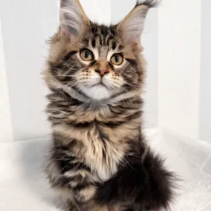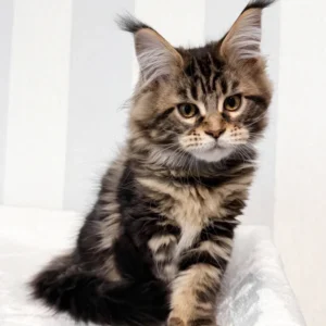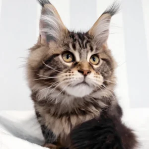 Hi, I’m Danny, a handsome brown classic tabby Maine Coon boy with warm golden eyes and a true forest cat look. My coat is rich with deep brown tones and bold, swirling tabby patterns, finished with a fluffy tail that follows me like a proud banner. One of my most striking features is my tall, lynx-tipped ears—long, sharp tufts that are becoming increasingly rare in true Maine Coons.