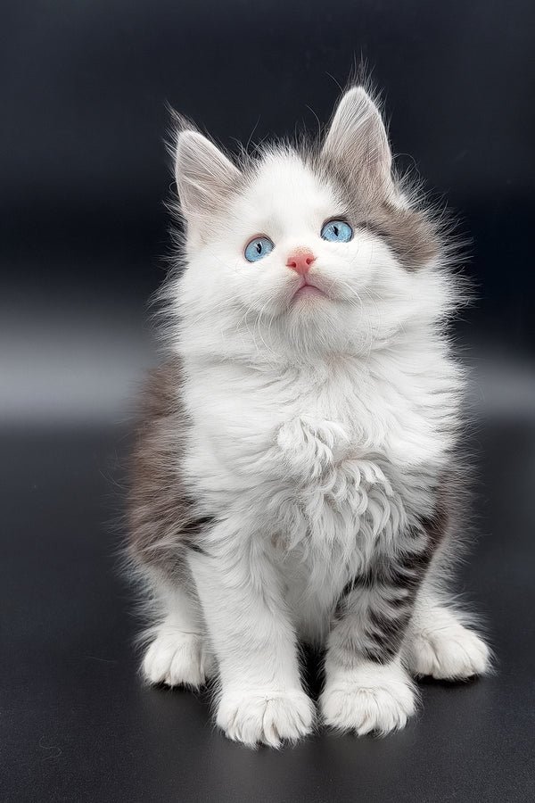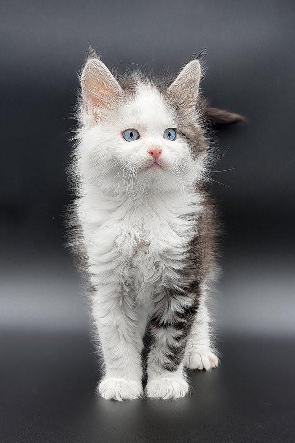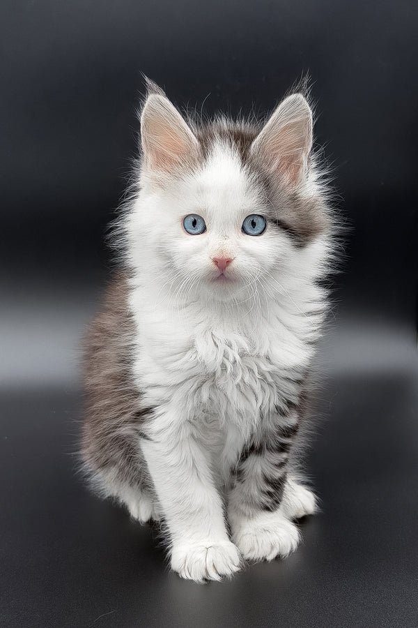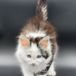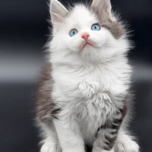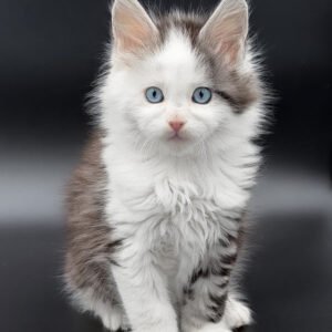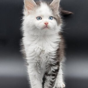 My name is Herman, and I am a Maine Coon boy with a striking black smoke coat touched with white and clear blue eyes that quietly observe everything around me. My long body and strong frame reflect the natural power and presence my breed is known for. Maine Coons are often called gentle giants because of their loyal, calm nature and strong connection with their families. Even as a kitten, I carry that balanced spirit. I enjoy being near people, watching daily life unfold, and slowly becoming part of your home and routine.