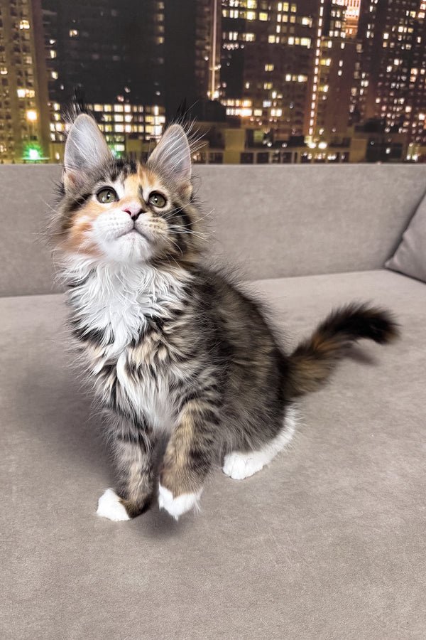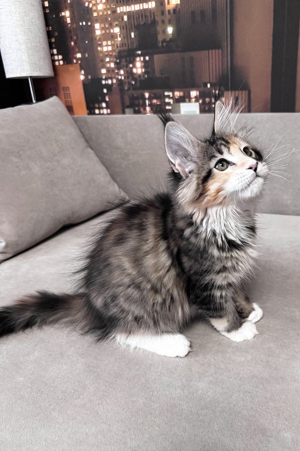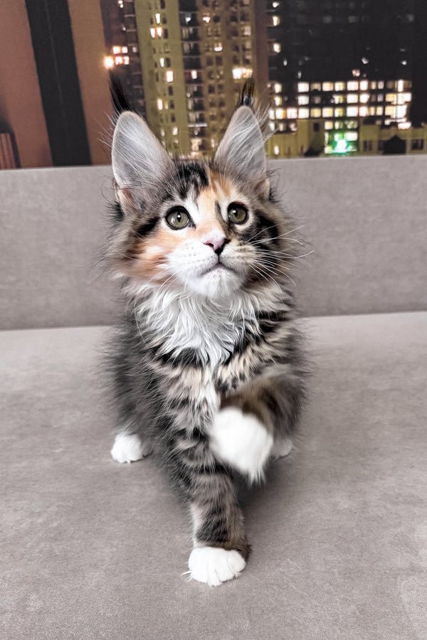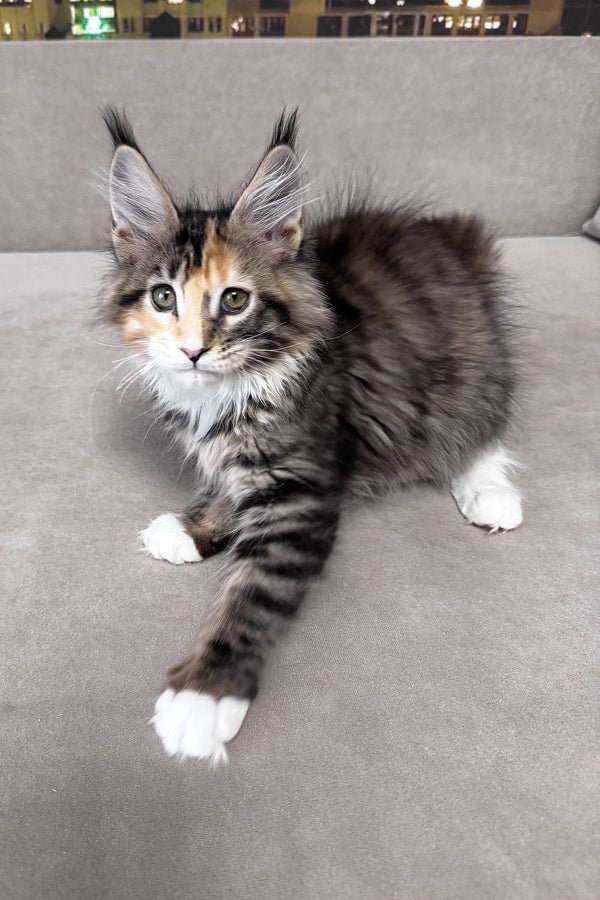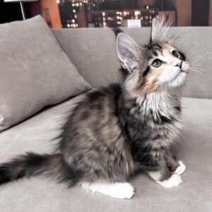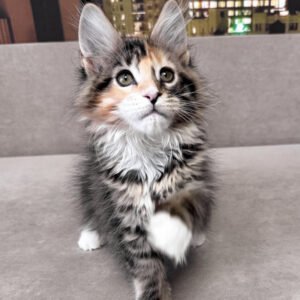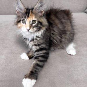 My name is Indiana, and I am a brown tortoise mackerel tabby Maine Coon girl with bright green eyes and soft white accents. My coat carries warm tortoise shades layered over clear tabby stripes, giving me a lively, expressive look. I already show the strong, balanced type my breed is known for, yet my gaze is gentle and attentive. I am not afraid of loud sounds. I stay steady and observant, taking in the world with quiet confidence. I am smart and quick to understand what is happening around me.