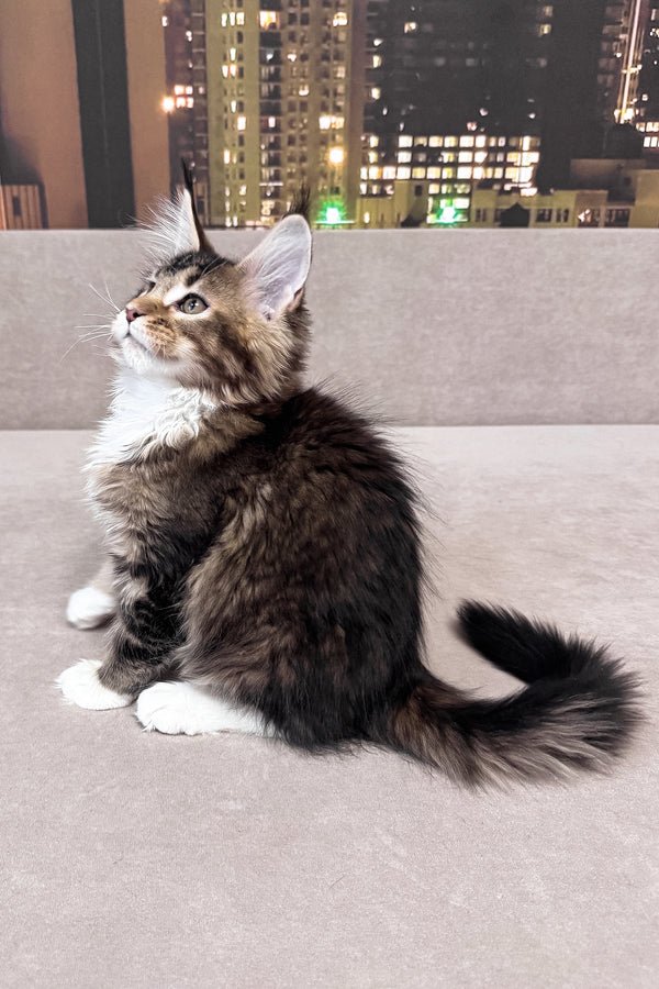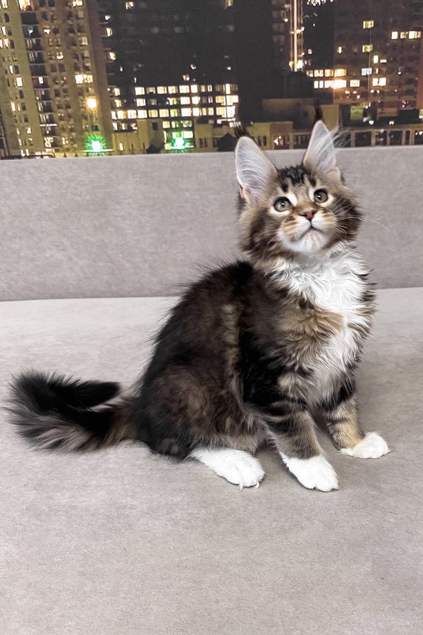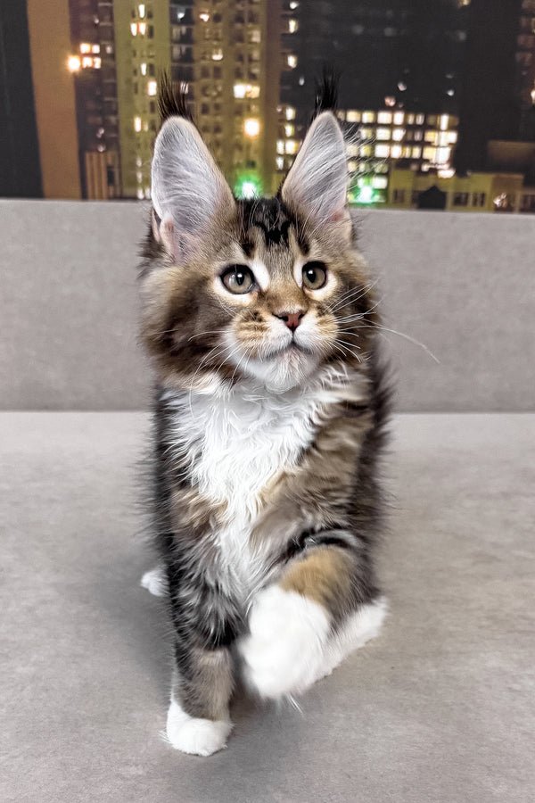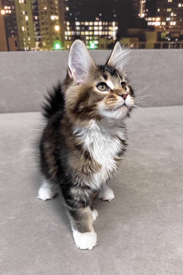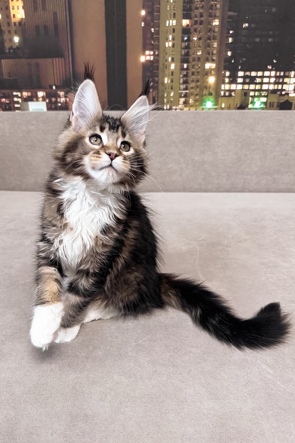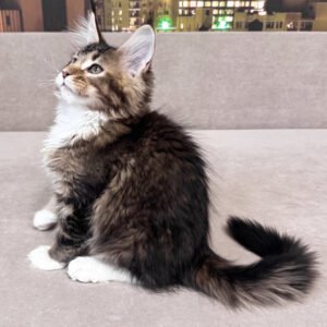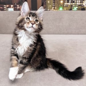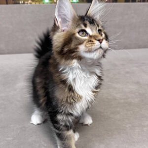 My name is Iris, and I am a brown tortoise ticked tabby Maine Coon girl with soft white accents and clear green eyes. My coat carries delicate ticking layered over warm tortoise tones, giving me a bright and expressive look. I already show the balanced structure and confident presence my breed is known for, yet my nature is gentle and thoughtful. I am smart and attentive, and loud sounds do not frighten me. I stay calm, watching and understanding before I react.
